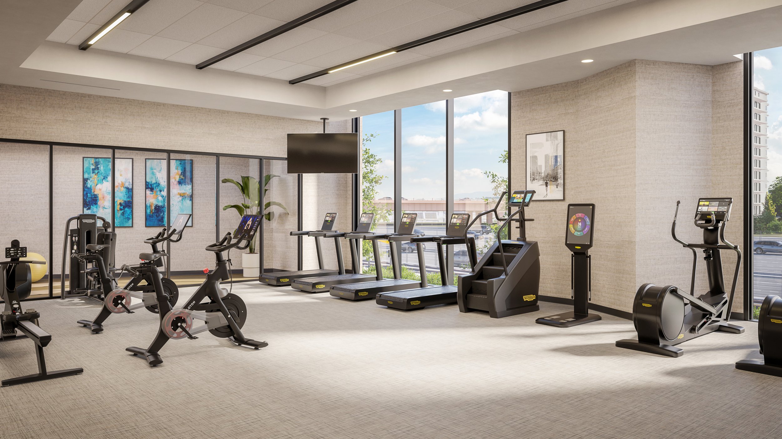 Includes Peloton bikes, cardiovascular equipment, elliptical machines, rowing machine, stair climber, treadmills and semi-private yoga studio | complimentary